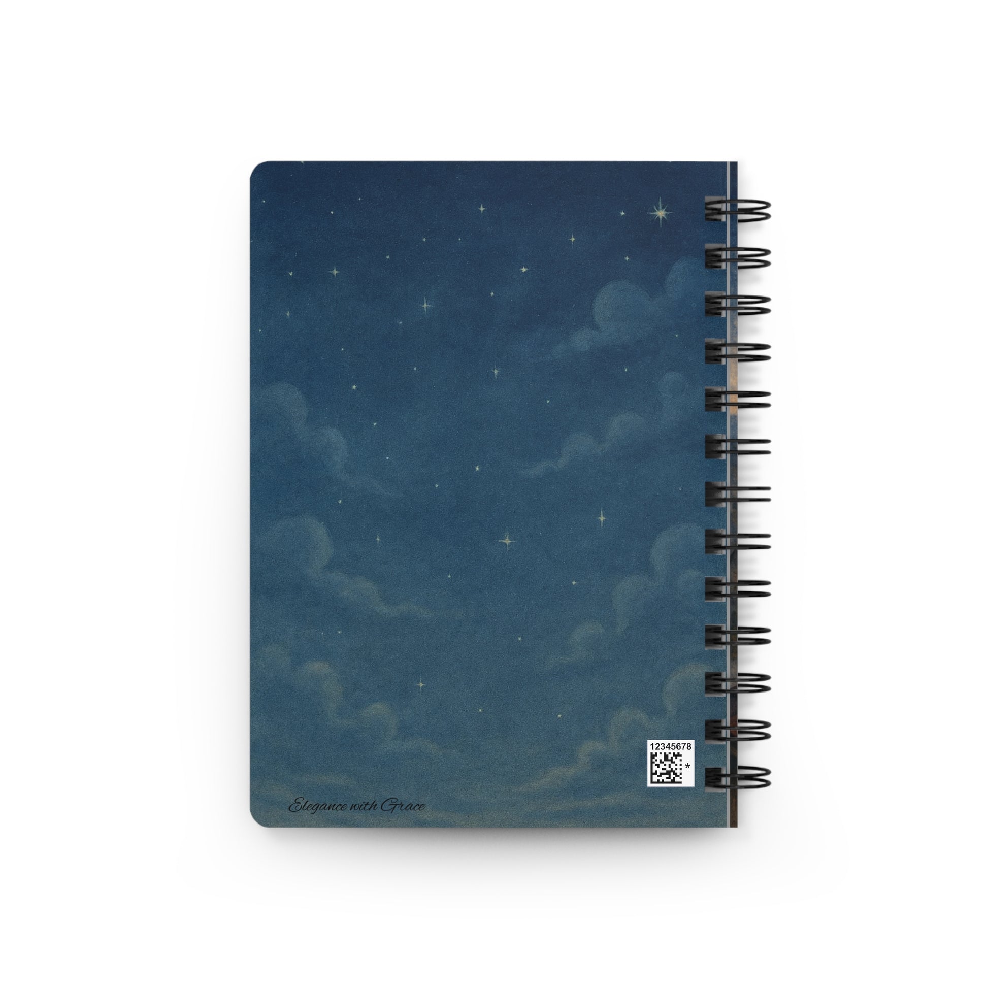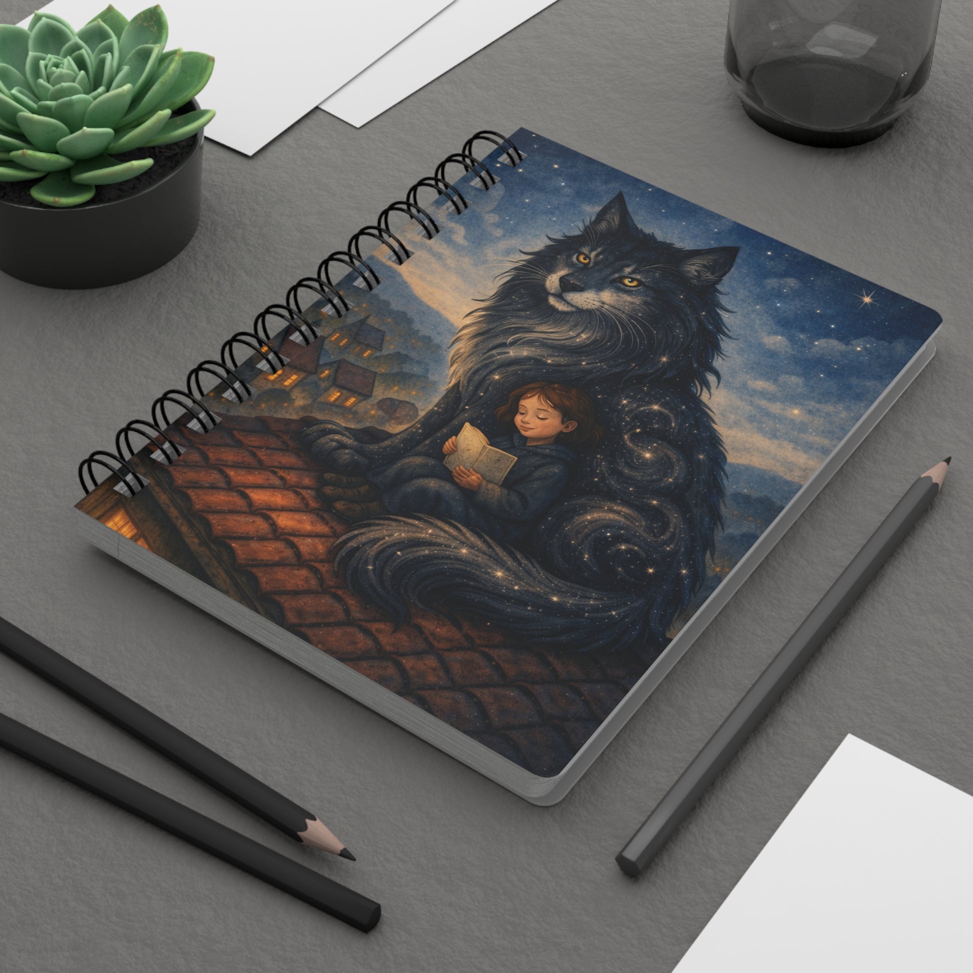 On a quiet rooftop beneath a quilt of stars, a gentle giant cat curls like a guardian while a child loses themselves in a book. This spiral bound journal carries that soft, moonlit hush into your hands. The glossy laminated cover catches the light and holds the vivid illustration steady — bright stars, a sleepy village below, and the warm closeness between watcher and dreamer. Inside, crisp lined pages invite lists, late-night thoughts, sketches and stray story ideas. The removable metal spiral makes it easy to pull a page or lay the book flat for writing. Keep it on a bedside stack for short, sweet reflections after dark, tuck it in a bag for slow afternoons at a café, or bring it along for quiet travel journaling when streets grow calm and thoughts stretch long.